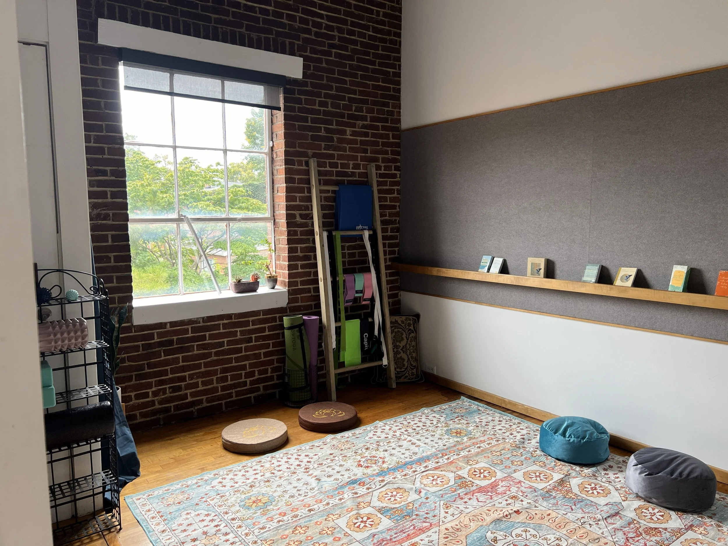 A thoughtfully designed studio for small-group movement and body-based sessions. The Zen Studio comfortably accommodates one instructor with up to two participants, making it ideal for private or semi-private yoga, therapeutic movement, or mindfulness-based practices. Exposed brick, high ceilings, and wood floors create a warm, grounded atmosphere. Yoga equipment provided to support your work in this serene, light-filled space.
